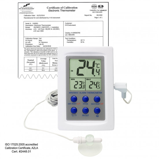 Bel-Art, H-B DURAC Calibrated Dual Zone Electronic Thermometer with Waterproof Sensor; -50/70C (-58/158F) External, 0/50C (32/122F) Internal